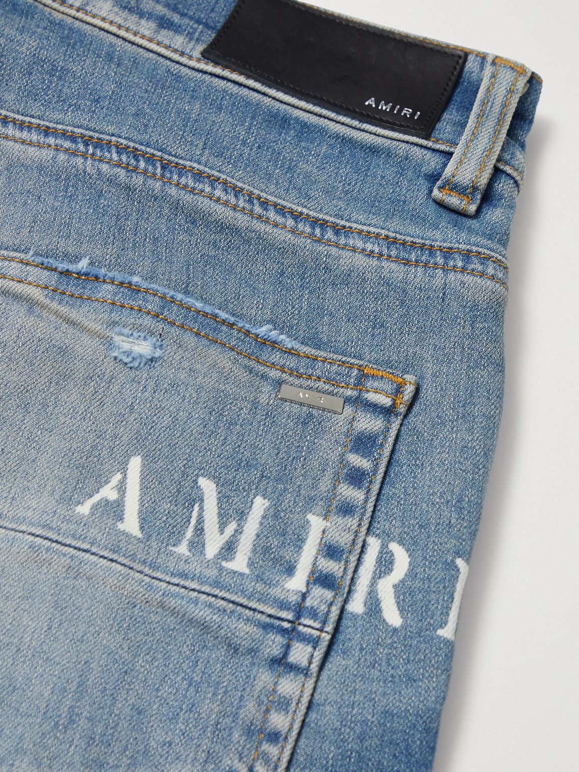 These jeans are cut in AMIRI's signature skinny fit and ripped and frayed at one knee. They're distinguished by the white hibiscus print that runs the full length of each leg and branded with a logo on the back pocket.